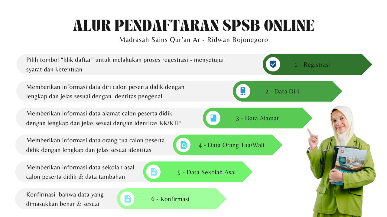 MA SAINS QUR'AN AR - RIDWAN menyediakan SPSB secara online diharapkan proses SPSB dapat berjalan cepat dan bisa dilakukan dimanapun dan kapanpun selama sesi SPSB Online dibuka. Proses pendaftaran calon siswa baru yang terhambat oleh jarak jika datang ke madrasah langsung, bisa mengakses website SPSB Online MA SAINS QUR'AN AR - RIDWAN.